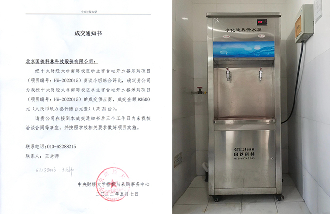 2022年5月,我公司中標(biāo)中央財(cái)經(jīng)大學(xué)南路校區(qū)學(xué)生宿舍電開水器采購項(xiàng)目。此次采購了24臺(tái)國(guó)林凈化開水器。