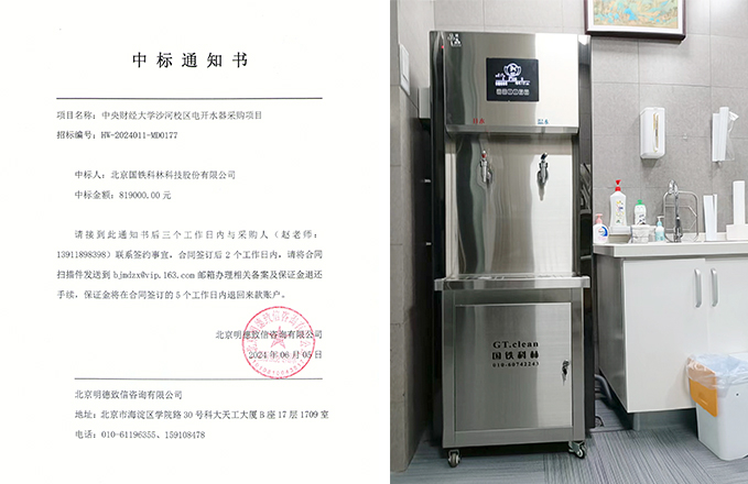 2024年6月,我公司中標(biāo)中央財(cái)經(jīng)大學(xué)沙河校區(qū)電開水器采購項(xiàng)目。此次采購了70臺(tái)國(guó)林凈化開水器。